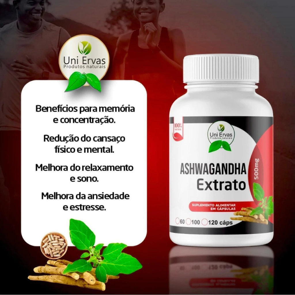 Suplemento alimentar em cápsulas à base de Ashwagandha (Withania somnifera), planta tradicionalmente utilizada na medicina ayurvédica. Este extrato natural é conhecido por seus efeitos adaptógenos, que ajudam o organismo a lidar melhor com o estresse físico e emocional, além de auxiliar no equilíbrio mental e no bem-estar geral.