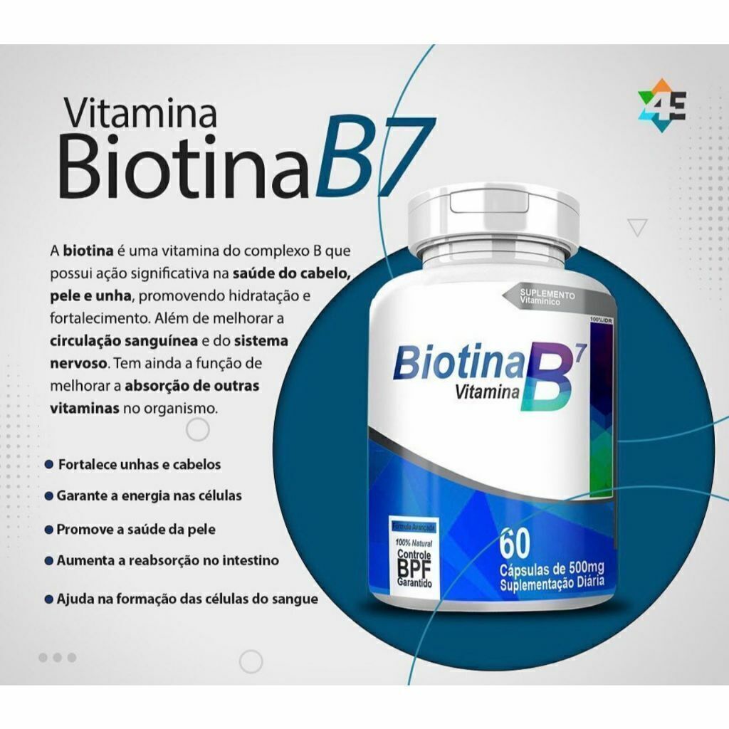 Biotina B7 500mg 60 Cápsulas MARCA: 4ELEMENTOS Benefícios: -Ajuda no crescimento dos cabelos e, portanto, na queda capilar; -Ajuda no fortalecimento das unhas, evitando que elas fiquem quebradiças; -Ajuda na resistência da pele, de forma a dificultar o aparecimento de erupções cutâneas; -Ajuda no controle da diabetes, por conta da quebra e absorção da glicose; -Ajuda na formação das células do sangue. Como Tomar? Recomendação de Uso: Tomar 1 Cápsula ao dia. Ou conforme indicação do Médico ou Nutricionista. OBSERVAÇÃO: Como qualquer outro produto NATURAL, os resultados não são de um dia para outro. O uso de Biotina B7 é um TRATAMENTO NATURAL e seu efeito inicia após alguns dias de uso. Composição: Vitamina B7 ( biotina ) INFORMAÇÕES REGULATÓRIAS: Dr. Whesley Brito Da Silva CRF-3450 MT . Produto Dispensado de Registro Conforme RDC ANVISA 23/00, 240/18 IN 28/2018. Produtos regulamentados pela Anvisa. ENVIOS: Nosso modelo de negócio é a pronta-entrega e com envio imediato. Despachamos o produto em no máximo em 24 horas úteis (na grande maioria bem antes disso).