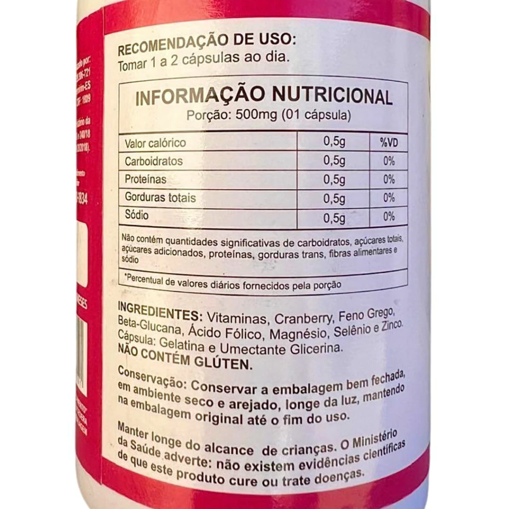 Vitaminas, Cranberry, Feno Grego, Beta-Glucana, Ácido Fólico, Magnésio, Selênio, Zinco.