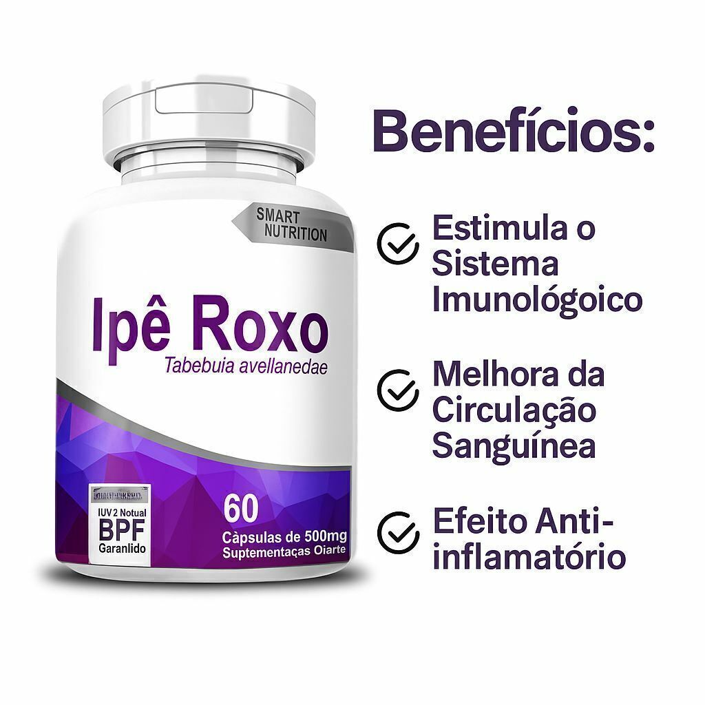 Cada cápsula contém 500mg de extrato de Ipê Roxo, garantindo praticidade e eficácia na suplementação diária.