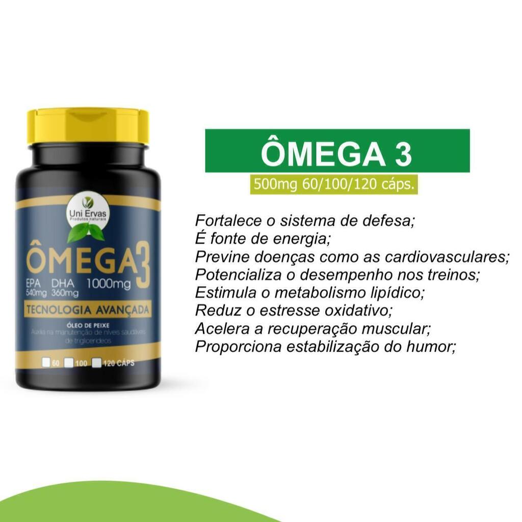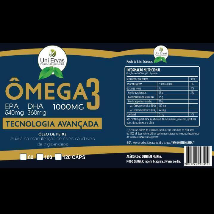 O Ômega 3 Uni Ervas é um suplemento alimentar de alta qualidade, formulado com óleo de peixe purificado, que oferece 1000mg por dose, sendo 540mg de EPA e 360mg de DHA. Essencial para a saúde cardiovascular, desempenho físico e bem-estar geral.